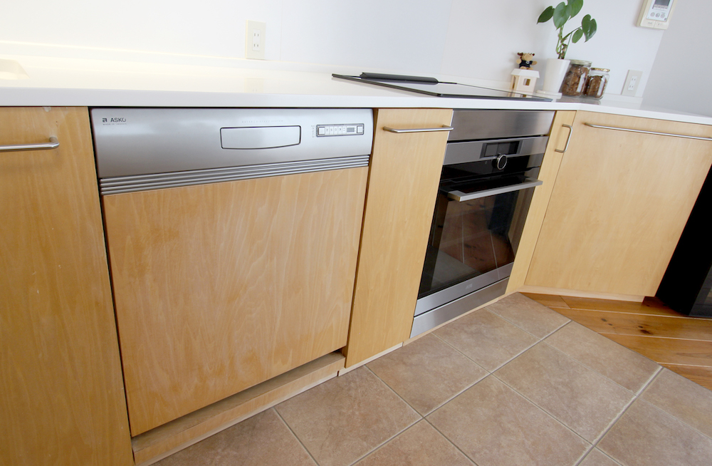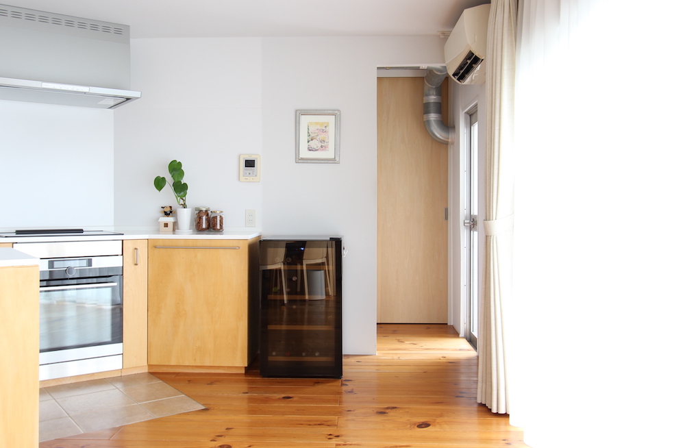 キッチン本体は木製。2011年にリノベーションしてから徐々にいい色に変化してきています。白い天板は丈夫で扱いやすく、手触りのいい人工大理石を採用。売主様は以前こちらで料理教室をされておられ、ハードに使ってもかなりきれいな状態のままです。