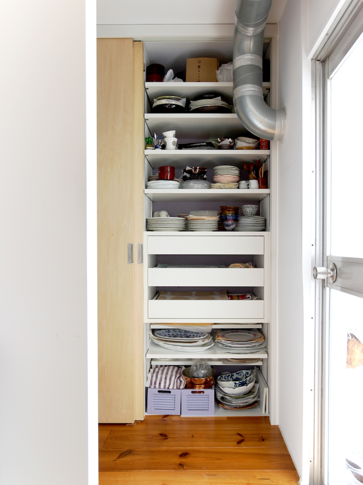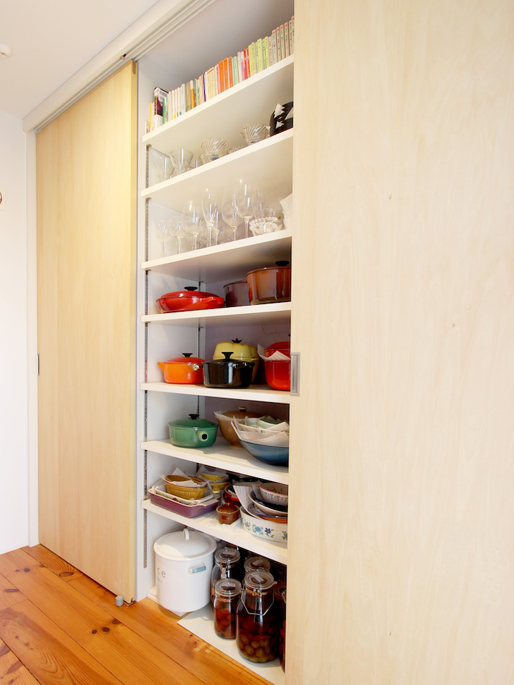 キッチンの奥には、パントリー兼ランドリースペースがあります。細かく作り込まれた収納は、2023年にオーダーメイドで設置されたものです。大量の食器や重量感のある鍋類を収納できるよう、丈夫な棚板になっているそう。
