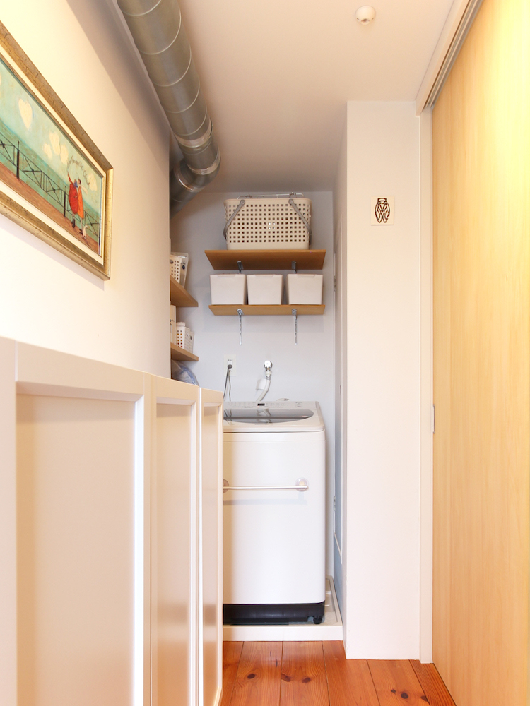 ▷一番奥にはランドリースペースがあり、こちらにも収納が造作されています