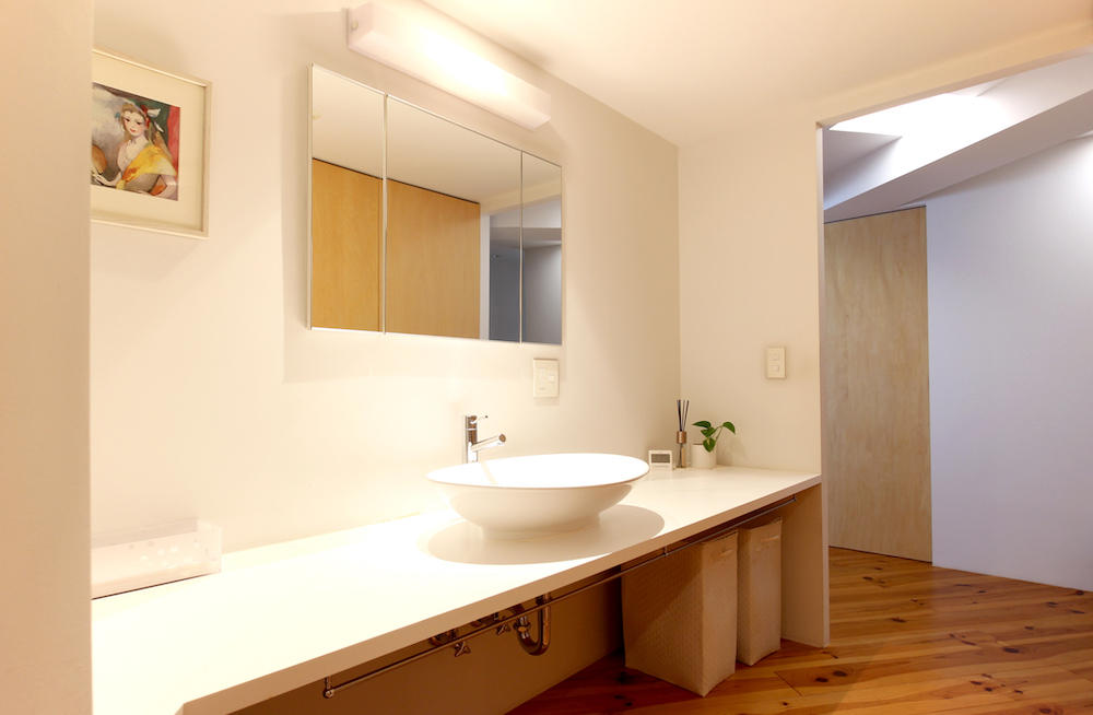 玄関ホールの左手には洗面、脱衣、バス、トイレがあります。洗面台は幅広い造作天板。ミラーは収納になっていて、三面鏡になるタイプです。売主様は化粧品や歯ブラシなど生活用品を収納しているそうです。