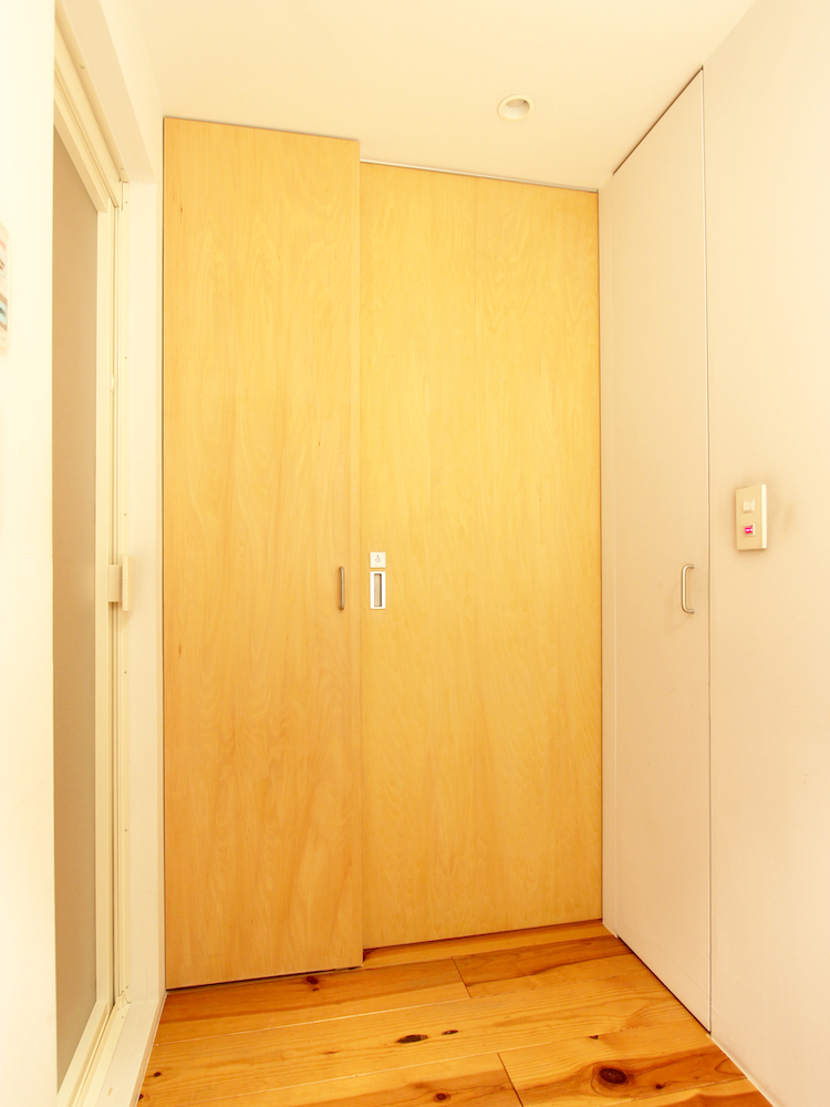 ▷トイレは木製の引き戸。左手と右手の白い扉は収納です