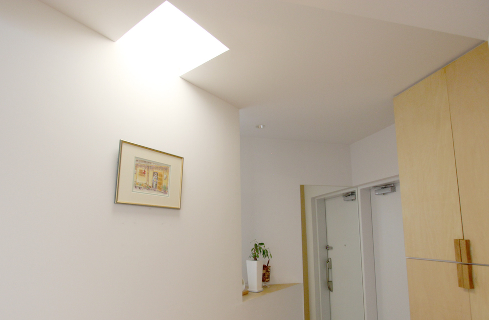 ▷天井には天窓のように見える照明。この家の各所に仕込まれているのですが、さりげなく、空間を美しく照らしてくれます