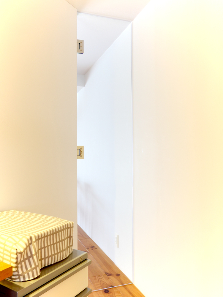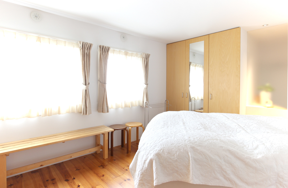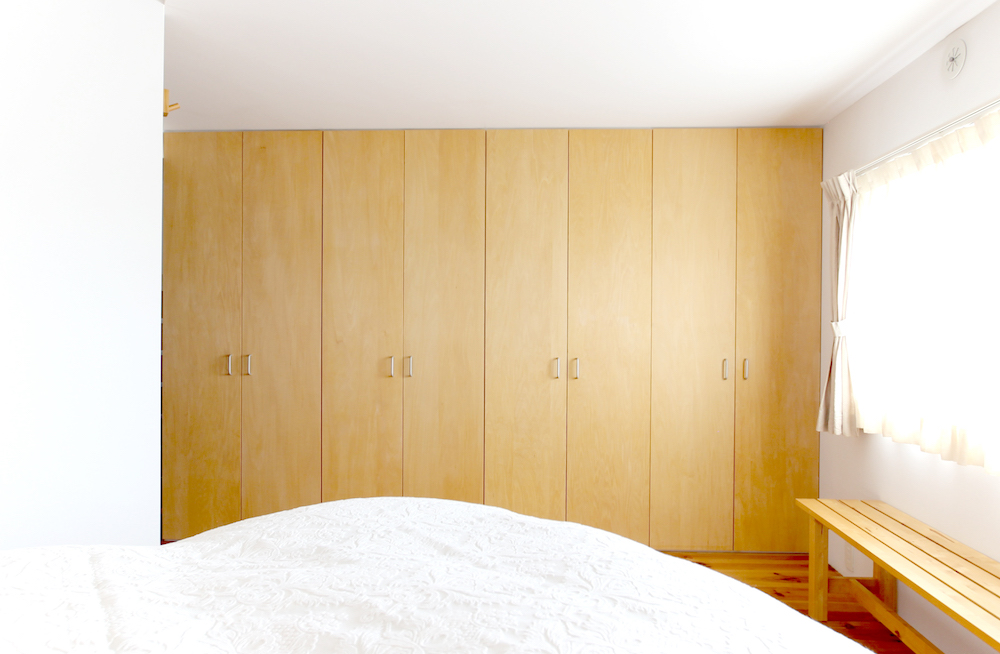 玄関ホールからアクセスできる約13.4帖のベッドルームは、大まかにベッドスペースとワークスペースに分かれています。売主様はダブルベッドを配置されていて、ちょうどいいサイズ感です。ベッドスペース側の収納には全身ミラーが造作されていて、便利です。