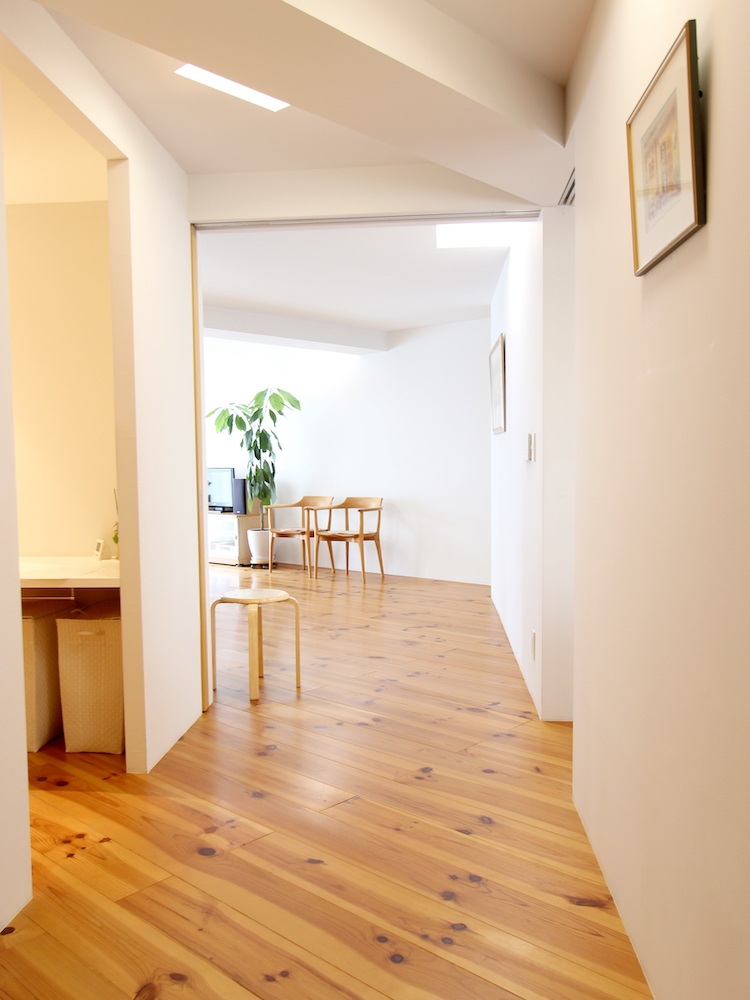 ▷キッチンの床は水に強い磁器タイル。他の居室部分はパイン材の無垢フローリングです
