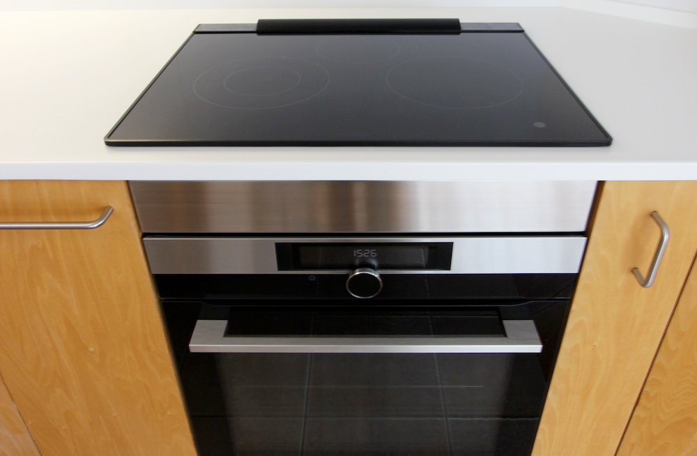 ▷2023年に新設した三菱製3つ口IHコンロとAEGのビルトイン電気オーブン。オーブンは71Lサイズ、300℃まで設定可能な本格派