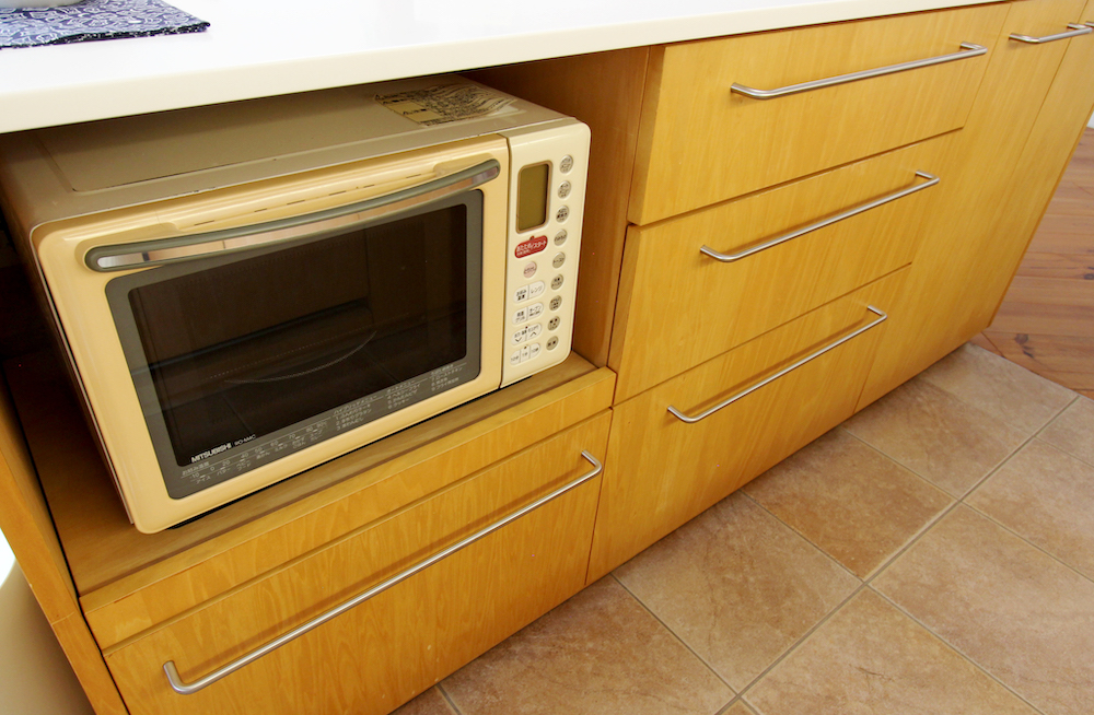 ▷カウンター下には電子レンジ置き場があり、使用時には引き出して使うことができます。