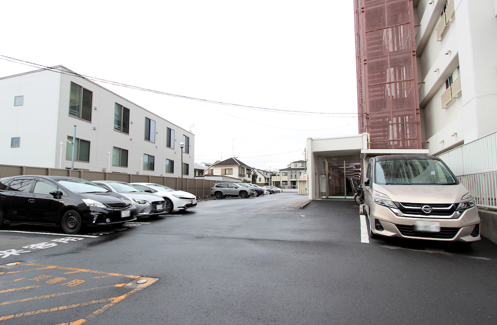 敷地面積は3000㎡近くあり、建物を囲むように平置き駐車場が配置されています。台数は、驚くことに58台分も備えられているんです。このお部屋には駐車場の専用使用権があり、月額7,000円で使うことができます。そう、必ず使える上に7,000円というのはありがたいですよね。