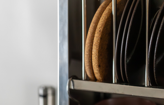 ▷レストランの厨房にあるような業務用のステンレスの食器棚。無骨さがかっこいい!お気に入りのグラスや器を美しく並べる「見せる収納」が、毎日のキッチンワークの気分を高めてくれます