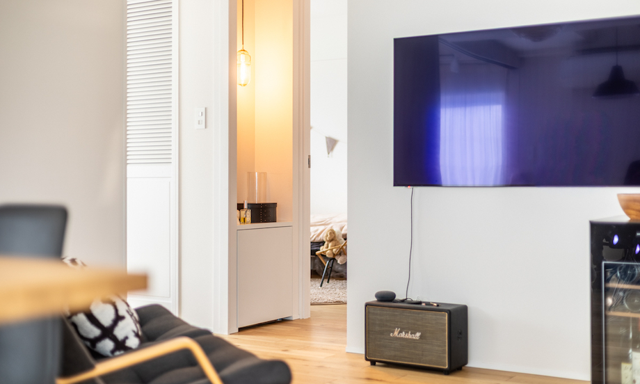 ▷テレビボードを置かず、壁掛けにすることで足元が広くすっきりとした印象に。Marshallのスピーカーやこだわりのワインセラーなど、お気に入りのアイテムだけを厳選して並べた、大人の上質なリラックス空間です