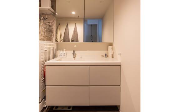特に、洗濯に関わる動線の改善はよかったです。洗濯機と洗面台の向きを揃えたことで面が揃って空間が整理されたのと、洗濯機の前にハンガーバーを設けて、洗濯物の一時置き場にしたのがとても便利です。取り出した洗濯物をハンガーにかけながら、干す場所を検討できるんですよ。洗濯機の前でいったん整えたうえで、すぐ隣の寝室にあるハンガーバーに干したり、その先のベランダに干したり。来客がある日は浴室に干すこともあります。コンパクトなスペースながら機能的になりました。